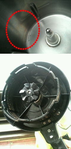 ▲제품 내부의 녹슨 흔적(위)과 깨끗한 물을 믹서기에 넣어 작동한 후 색이 변한 모습.