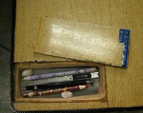 공개된 사진은 책상 한쪽을 잘라내 뚜껑처럼 여닫을 수 있도록 만들어 그 안에 필기구들을 넣을 수 있게 만든 공간이 생겨난 모습이다.(사진=온라인 커뮤니티)
