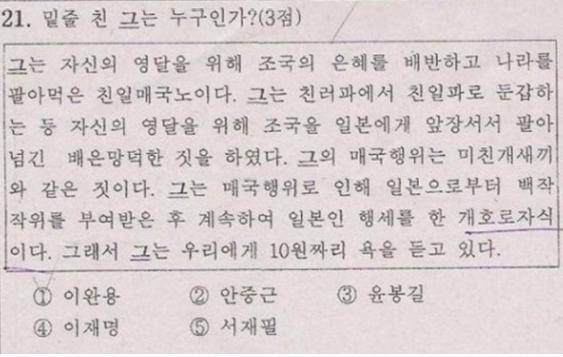 이 시험문제는 ‘이완용’에 관한 문제로 “미친개XX, 개호로자식, 그는 우리에게 10원짜리 욕을 듣고 있다”등의 거친 표현과 욕으로 이완용을 설명하고 있어 눈길을 끈다.