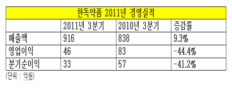 한독약품의 3분기 매출액은 916억원으로 전년동기(838억원) 대비 9.3% 증가했으나, 영업이익과 순이익은 추락했다. 영업이익은 83억원에서 46억원으로 44.4% 급감했으며, 분기순이익도 57억원에서 33억원으로 41.2% 감소했다.