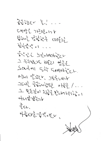 김태원의 손글씨 내용은 "궁금했다. 늘 대양을 가르던 이가 심해를 경험한 후 떠올릴 깊은 음악이.. 음악인은 노인이어야 한다. 그 누구보다도 빨리 영글은 soul에 도착되어야 한다"고 적혀있다.