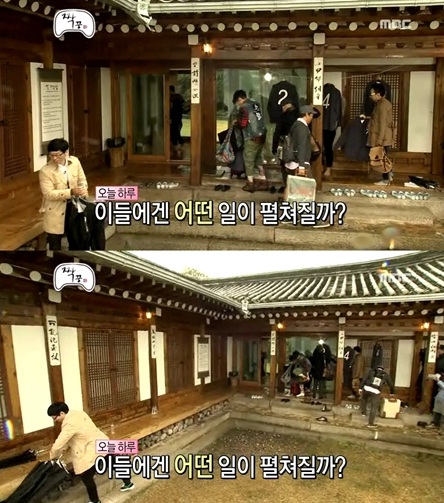 22일 방송된 MBC '무한도전-짝꿍 특집'에서 멤버들이 '우정촌'에 입소하던 이날 비가 쏟아졌다. 멤버들은 각각 준비한 우산을 사용했고 첫 만남 인터뷰를 가진 뒤 정해진 복장으로 옷을 갈아 입었다.
