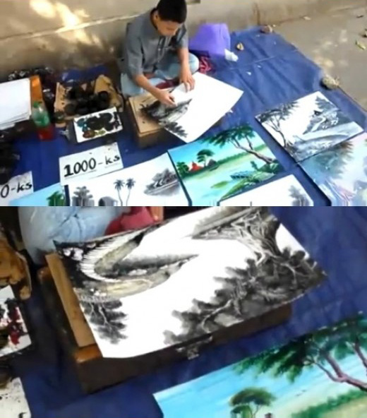 이 동영상에는 한 소년이 길거리에 앉아 다양한 풍경화를 완성하는 모습이 담겼다. 이 소년은 미얀마 양곤의
