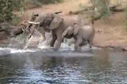 이 동영상에는 새끼를 데리고 강어귀에 물을 마시러 온 어미 코끼리의 코를 악어가 무는 모습이 올라와 있다.
