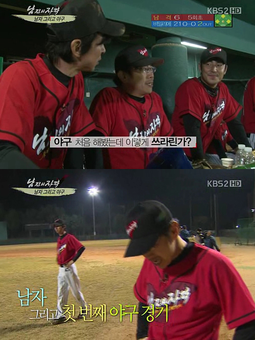 처음 공을 받아보는 포수 윤형빈은 손에 피멍이 들었고 아저씨들의 얼굴에는 땀이 가득했다. 김국진은 “야구 처음 해봤는데 이렇게 쓰라린 것이냐”며 허탈함을 숨기지 못했다.