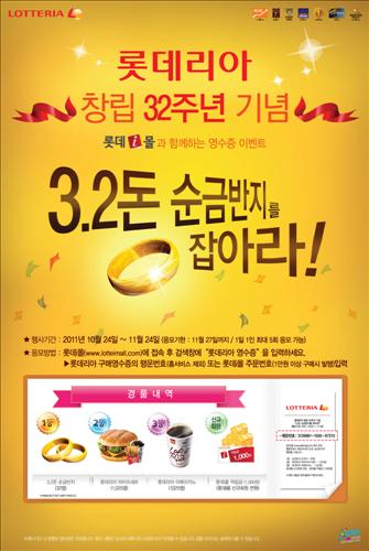 URL복사 기사공유하기 스크랩 프린트 메일보내기 글씨키우기 롯데리아는 창립 32주년을 맞아 롯데아이몰과 함께 한 달간 순금반지를 증정하는 경품 행사를 진행한다고 24일 밝혔다.롯데리아에서 받은 영수증의 행운번호나 롯데아이몰에서 1만원 이상 구매 후 발행된 주문번호를 롯데아이몰 홈페이지(www.lotteimall.com)에 입력하면 된다. 당첨자는 추첨을 통해 12월14일에 발표할 예정이다.1등 32명에게는 순금반지 12g(3.2돈), 2등 1천25명에게는 롯데리아 빅비프세트, 3등 1천25명에게는 롯데리아 아메리카노를 증정한다. 저작권자 © 소비자가 만드는 신문 무단전재 및 재배포 금지 지승민 기자 다른기사 보기 URL복사 기사공유하기 주요기사 GS그룹, 허용수·허세홍 부회장 승진...허철홍, GS엔텍 대표 선임 네이버파이낸셜-두나무 20조 원 빅딜 성립... 공룡 빅테크 탄생 [인사] 현대해상 김동연 지사, "여성폭력 근절 경기도가 함께 할 것"...젠더폭력 통합대응단, 4만488명 지원 롯데건설, '부도설' 최초 유포자 경찰 고소…"허위사실 유포 강력 대응" 롯데, 세대교체 단행...부회장 전원 용퇴·CEO 3분의 1 물갈이