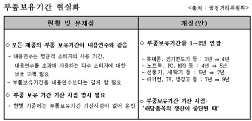 이에 대해 공정거래위원회 소비자정책국 관계자는 “현 소비자기본법상에는 제조사가 부품보유기한 지키지 않더라도 직접적 제재조치를 가할만한 벌칙 기준 등이 없다”며 “그 대안으로 소비자분쟁해결기준 개정안이 최근 행정 예고되면서 제조사가 부품보유기한을 지키지 않은 경우 소비자가 받을 수 있는 배상기준이 상승될 예정”이라고 밝혔다.