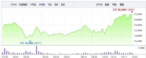 인터플렉스는 코스닥시장에서 24일 전일 대비 0.48%(150원) 내린 3만800원으로 장을 마감했다. 장중 최고가인 3만2천250원을 기록하며 지난 1월 5일 연중 최고가인 3만5천800원에 다가서는 흐름을 보였다.