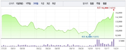 이녹스도 코스닥시장에서 전일 대비 무려 10.88%(1600원)나 상승한 1만6천300원으로 거래를 마쳤다. 장중에는 최근 5개월 사이 최고가인 1만6천900원까지 오르기도 했다.