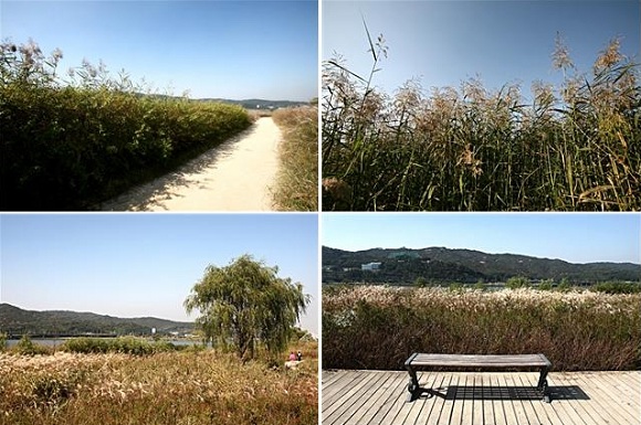 먼저 암사생태공원이다. 이곳은 한강에서 군락을 이루는 유일한 곳이다. 1km의 산책로를 따라 강변에서 올림픽대로 쪽으로 갈대, 물억새, 억새가 단계적으로 군락을 이루는데, 그 풍경이 아름답기로 손꼽히는 명소다.