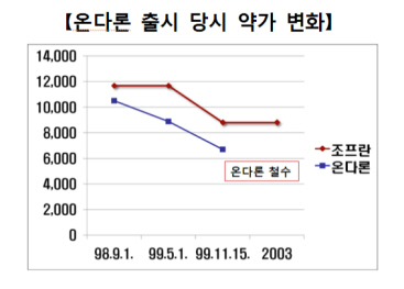 2000년 당시 온단세트론 성분 항구토제 시장에서 GSK 신약 조프란이 100% 점유율을 가지고 있었다. 동아제약은 1998년 조프란의 복제약 온다론을 출시하고 다음해인 5월 온다론 약가를 조프란의 76%로 인하했다. 경쟁자를 따돌리기 위해 조프란도 따라서 가격을 내리는 등 선순환이 계속 일어났다.