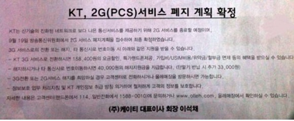 KT는 9월 22일 신문광고 등을 통해 “더 나은 통신서비스를 제공하기 위해 2G 서비스를 종료할 예정이며, 9월19일 방송통신위원회에서 2G 서비스 폐지 계획을 접수하여 최종 확정했다”고 공지했다.