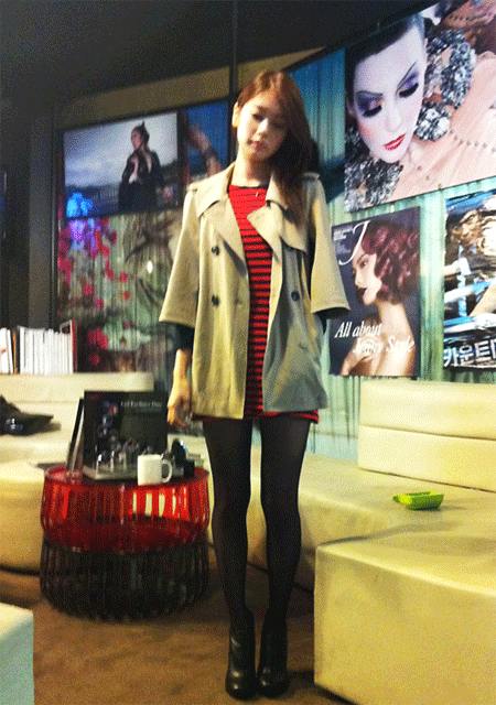 이날 정소민은 긴 생머리와 산뜻한 컬러의 스트라이프 초미니 원피스에 브라운 컬러의 케이프 코트를 매치한 옷차림을 선보였다.