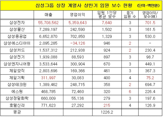 삼성전자와 삼성테크윈은 701.5배와 694.7배로 실질적 임원보수는 높지 않았다.