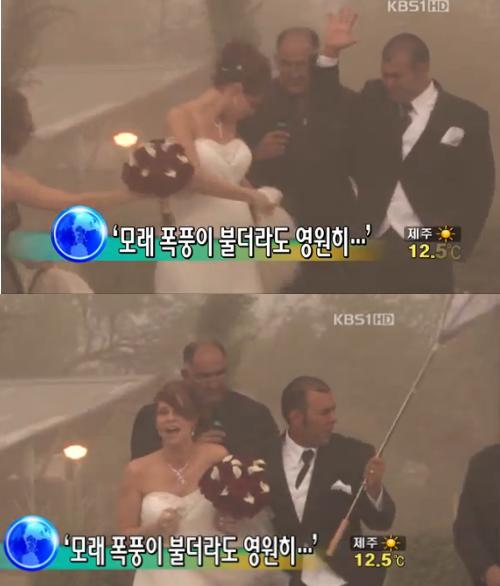 이에 하객들은 급히 자리를 뜨고 신랑 신부는 재빨리 키스를 하고 황급히 결혼을 마무리하는 황당한 일이 벌어졌다. (모래폭풍 결혼식, 사진-KBS 방송 캡처)