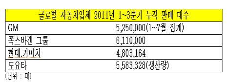 특히 눈에 거슬리는 것이 도요타다. 지난해 840만대 판매로 2년 연속 1위를 기록했던 도요타는 리콜, 대지진 등으로 올해 상반기 5위에 그쳐 체면을 구겼지만, 하반기에는 맹추격세를 보이고 있다.