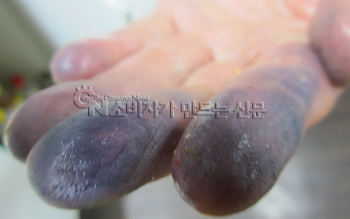 31일 서울시 종로구에서 식당을 운영하는 한 모(여.35세)씨는 최근 집 근처 농협 하나로마트에서 구입한 가지를 찌는 중 보랏빛을 띠는 물이 지나치게 많이 빠져 손가락이 온통 적색으로 물들었다며 본지에 도움을 청했다.