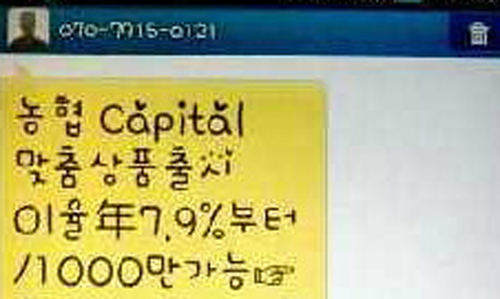 31일 서울 은평구에 사는 이 모(여.29)씨에 따르면 그는 며칠 전 휴대폰으로 “농협capital 맞춤상품 출시, 年7.9%부터 / 1000만 대출 가능”라는 내용의 대출 유도 문자를 받았다.