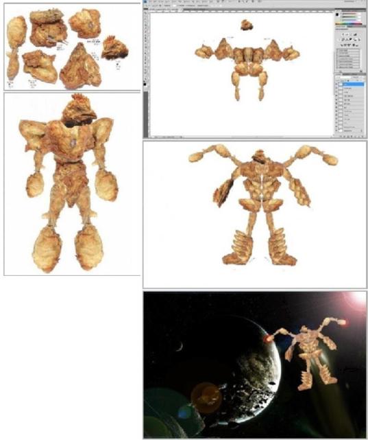 두마리 치킨 조립 사진은 치킨 조작들을 쭉 진열해놓고 이것들을 마치 로봇 조각들처럼 조립해 나가기 시작한다.