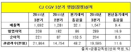 CJ CGV의 3분기에 전기 대비 48%대의 영화 관람객 수 증가로 1천692억원의 매출액을 달성했다. 전년 동기대비 9.4% 증가해 사상 최대치를 기록했으며 누계실적으로는 4천억원을 넘어섰다.