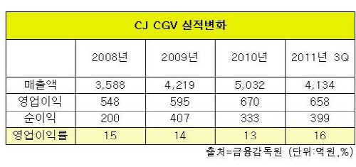 이어 4분기에도 ‘도가니’와 ‘의뢰인’등 연이은 흥행작들로 매출 성장에 탄력이 붙을 것으로 예상된다. CJ CGV의 4분기 매출과 영업이익 추정치는 각각 1천315억원과 122억원이다.