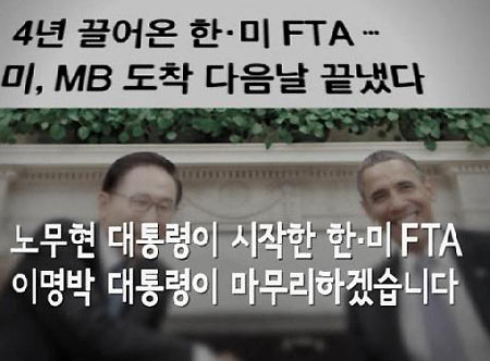 지난 27일 첫 방영되며 논란이 되고 있는 한미 FTA 광고는 "노무현 대통령이 시작한 한미 FTA, 이명박 대통령이 마무리하겠습니다"라는 해설 까지 등장해 파장을 일으키고 있다.