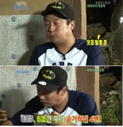 한편 이날 엄태웅은 '딸기게임'에서 연속으로 패해 제대로 먹지도 못한채 설거지를 하는 모습을 보여 안타까움을 안겼다. (이수근 5초 식사, 사진- KBS 방송 캡처)