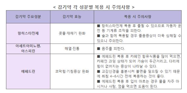식품의약품안전청은 최근 환절기를 맞아 감기환자들이 늘어나자 안전한 감기약 복용을 위한 감기약 성분에 따른 주의사항을 안내했다.