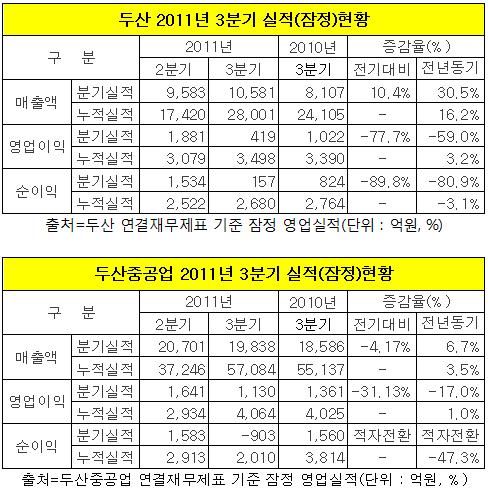 연결재무제표를 기준으로 두산은 올 3분기 순이익이 지난해 동기대비 80% 이상 급감했다. 두산중공업은 아예 903억원 순손실액을 기록해, 적자경영으로 전환됐다. 두산인프라코어도 중국내 굴삭기 판매부진과 환손실로 실적부진이 예상된다.