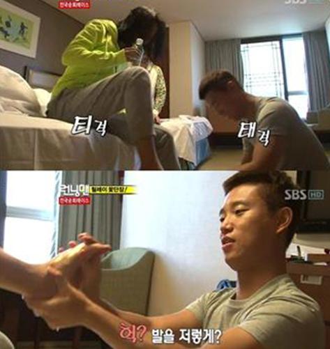 이에 개리는 잠이 덜 깬 송지효의 발을 정성스럽게 비누칠하며 씻겼다.
