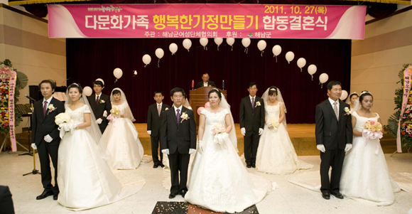 해남군여성단체협의회(회장 윤하숙)는 경제적인 어려움으로 결혼식이 늦어진 다문화가족 8쌍에 대해 지난달 27일 해남군 문화예술회관 다목적실에서 합동결혼식을 개최했다고 1일 밝혔다.