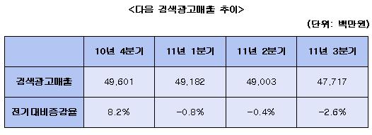 다음은 3분기 검색광고 부문에서 전분기 대비 2.6% 하락한 477억원의 매출을 기록했다.