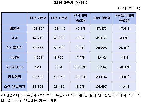 다음은 3분기 매출 1천34억원, 영업이익 285억원을 기록했다고 1일 공시했다. 지난해 같은 기간에 비해 각각 17.6%, 14.5% 증가한 수치지만 지난 분기와 비교하면 각각 0.1%, 39.9% 감소했다.
