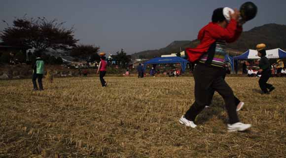 진도 백구마을에서 추수 끝난 논바닥에서 25년째 이어지는 마을잔치가 열린다.