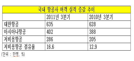 특히 양사 모두 국내선에서 저비용항공사에 밀려 여객 수가 줄고 있다. 전년동기(224만9천691명) 대비 대한항공 국내선 여객은 9% 감소했으며, 아시아나항공(2010년 3분기 115만6천549명)은 2% 감소했다.