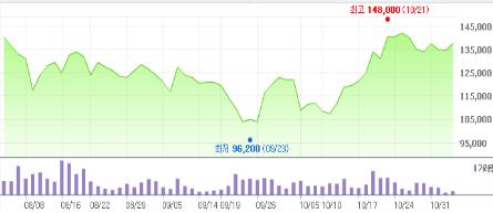 지난 9월에는 9만원대까지 떨어지며 약세를 보였던 신세계인터내셔날 주가는 10월 들어 차츰 회복세를 찾기 시작하더니 지난달 21일 장중에는 14만8천원으로 오르며 신고가를 기록했다.