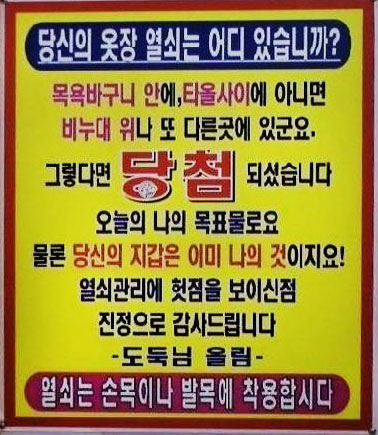 공개된 사진은 한 목욕탕에서 손님들에게 옷장 열쇠 관리를 주의하라는 내용을 재밌는 문구로 표현해 웃음을 준다.
