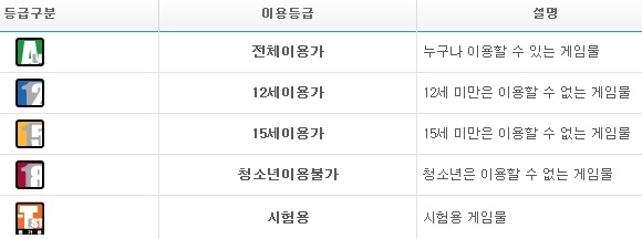 일반적으로 국내 유통되는 PC, 온라인, 모바일, 비디오 게임물의 등급은 ‘전체이용가’, ‘12세 이용가’, ‘15세 이용가’, ‘청소년이용불가’로 나뉜다.