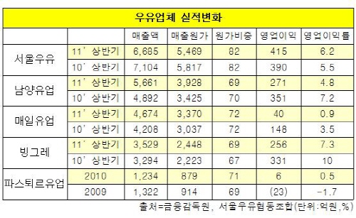 특히 업계 1위인 서울우유는 상반기 영업이익이 전년 동기대비 6%나 증가한 415억원을 달성했고 영업이익률도 0.7%p 상승한 6.2%를 기록해 누적적자 타령을 무색케했다.