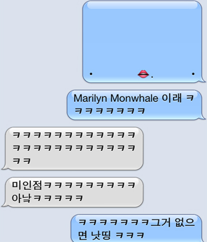 URL복사 기사공유하기 스크랩 프린트 메일보내기 글씨키우기 아이폰에서 문자메세지를 이용, 고래를 만들며 대화하는 캡처화면이 공개돼 네티즌들의 관심을 끌고 있다. 이 화면에는 이모티콘을 이용해 영국신사 고래, 마릴린 먼로 고래 등이 표현되어 있다. 네티즌들은 “너무 귀여워”, “저럴 땐 아이폰이 부러워”등의 반응을 보였다. 저작권자 © 소비자가 만드는 신문 무단전재 및 재배포 금지 온라인 뉴스팀 다른기사 보기 URL복사 기사공유하기 주요기사 GS그룹, 허용수·허세홍 부회장 승진...허철홍, GS엔텍 대표 선임 네이버파이낸셜-두나무 20조 원 빅딜 성립... 공룡 빅테크 탄생 [인사] 현대해상 김동연 지사, "여성폭력 근절 경기도가 함께 할 것"...젠더폭력 통합대응단, 4만488명 지원 롯데건설, '부도설' 최초 유포자 경찰 고소…"허위사실 유포 강력 대응" 롯데, 세대교체 단행...부회장 전원 용퇴·CEO 3분의 1 물갈이