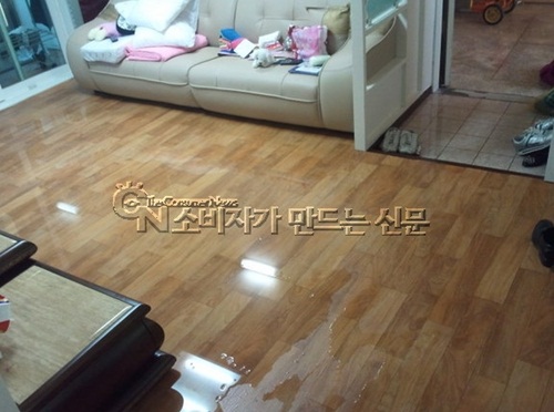 거실에 있던 라텍스매트와 전기장판, 나무선반, 소파가 물에 흥건히 젖어 있었고 심지어 아래층에도 물이 새는 바람에 김 씨는 이웃집 도배까지 책임져야 할 처지에 놓였다.