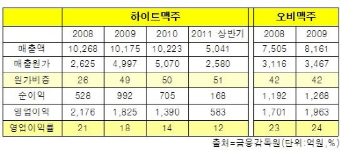반면 상대적으로 매출액 대비 매출원가의 비중이 낮은 오비맥주는 영업이익이 증가추세에 있다.