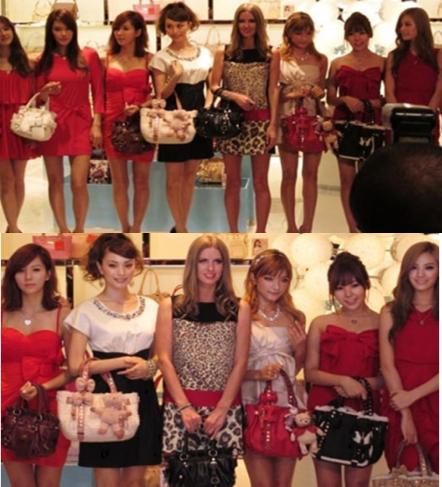애프터스쿨은 외국인 모델들과 함께 백화점의 한 가방 매장에서 나란히 서서 사진을 찍고 있다.