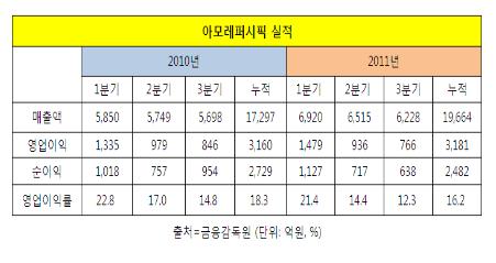 아모레퍼시픽의 국내화장품 사업은 설화수 등 프리미엄 브랜드 화장품 매출이 호조를 보이면서 백화점부문은 전년대비 21% 성장했지만 이미 커질대로 커진 방문판매 시장에서는 7% 성장에 머물렀다.