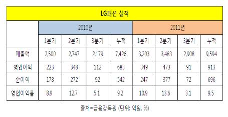 반면 한국투자증권은 나은채 연구원은 “LG패션은 매출액 증가율이 1분기 27%, 2분기 26% 3분기 33%로 안정적으로 증가하고 있다”며 “3분기 집중 호우와 소비둔화를 감안하면 긍정적인 성적”이라고 전했다.