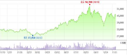 LG패션 주가는 올해 초 2만원대를 밑돌며 업계 대표 '저평가주'로 주목받았다. 하반기에는 4만원 대에 안정적으로 안착하며 3분기 실적 개선을 무기로 주가에 날개를 달 수 있을 지 관심이 모아졌지만 상승세가 한풀 꺽인 모양세다.