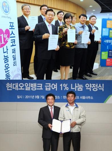 권오갑 현대오일뱅크 사장이 김태경 현대오일뱅크 노동조합위원장과 직원들의 급여 1% 나눔약정식을 가진 모습(사진 아래)>