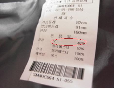 신 씨가 직접 제품 라벨을 살펴보니 역시나 '모 48%, 폴리에스터 52%'로 표기되어 있었다.