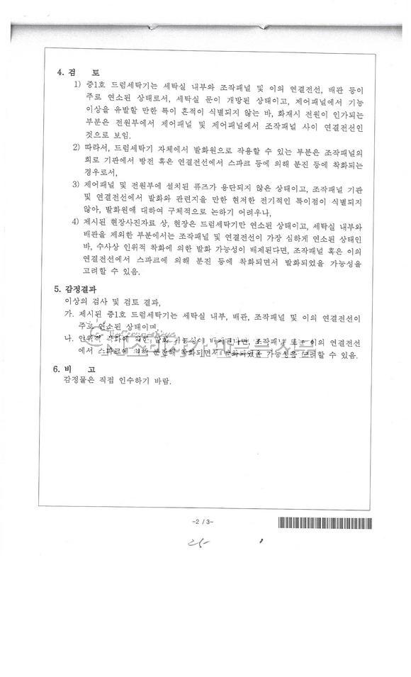 P.S : 이 글을 읽는 소비자 분들도 혹시 LG 세탁기를 쓰다가 불이 나서 국과수로 보낸다면 국과수에 전화해서 꼭 LG제품 결함이라는 문구를 적어달라고 하십시오. 안그러면 보상 못 받습니다.(제보자=조순호)