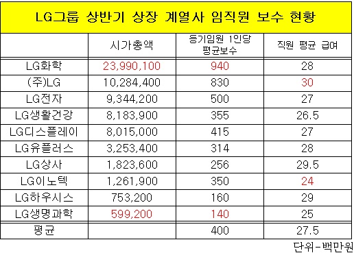 평균 임원 보수는 4억원이었으며, 가장 낮은 곳은 1억4천만원의 LG생명과학(사장 정일재)과 1억6천만원의 LG하우시스(사장 한명호)가 차지했다. LG화학과는 5.8~6.7배의 차이를 보였다.